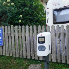 De oplader staat op de parkeerplaats van de camping en kann altijd gebruikt worden.